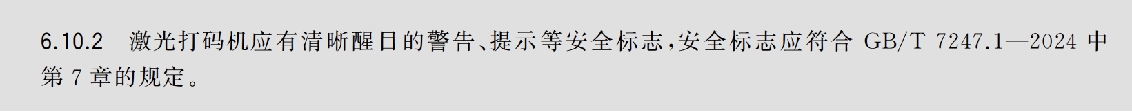 激光打码机应有清晰醒目的警告、提示等安全标志,安全标志应符合GB/T7247.1—2024 中第 7 章的规定。